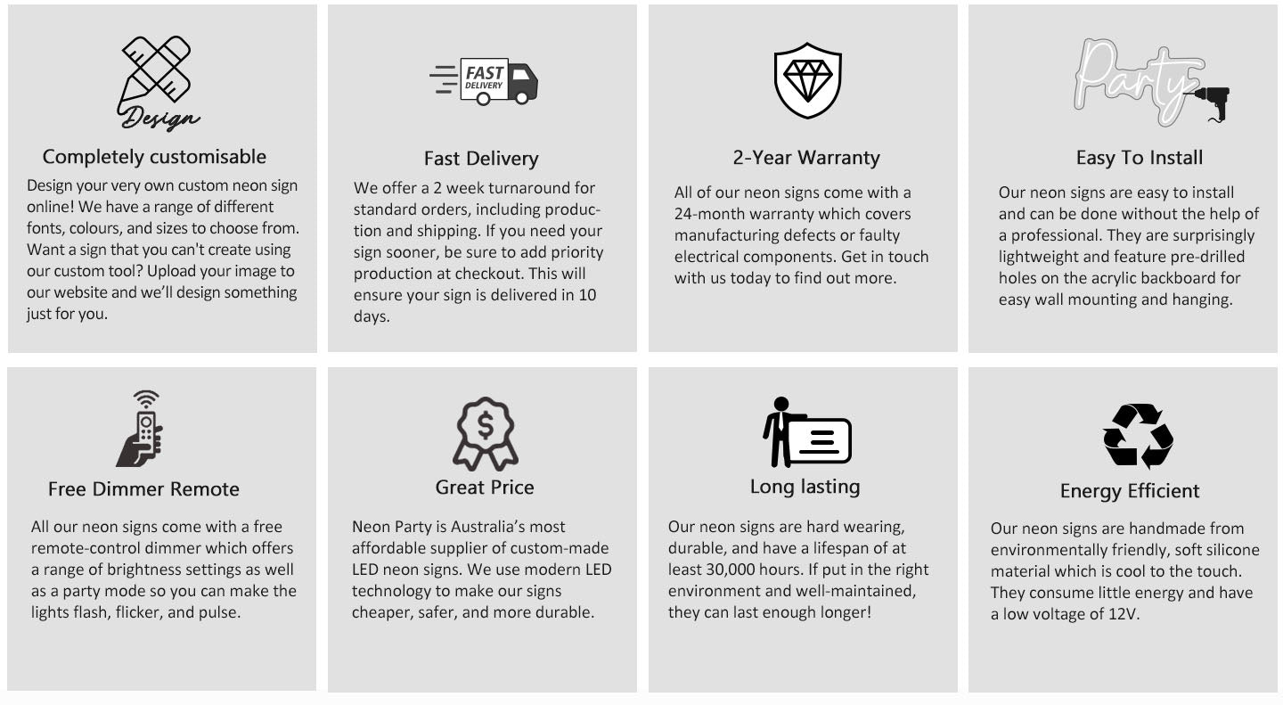 Our LED neon signs come with a 24 month warranty. This covers faulty items, when used appropriately. Please not that we require both a video and photo(s) for diagnostic and quality purposes.